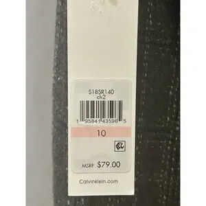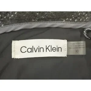 The NWT Calvin Klein Gray Textured Pencil Skirt in size 10 is a stylish and sophisticated addition to any woman's wardrobe. Made from a blend of polyester, spandex, and rayon, this skirt features a solid gray color and a straight, pencil style. With a knee length design and a subtle slit, this skirt is perfect for a professional or dressy look. The zipper closure adds a touch of convenience, while the lining ensures comfort and quality. Perfect for those who appreciate the classic Calvin Klein brand and timeless style.