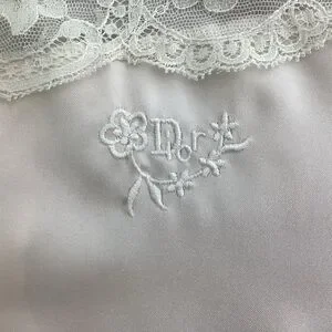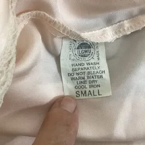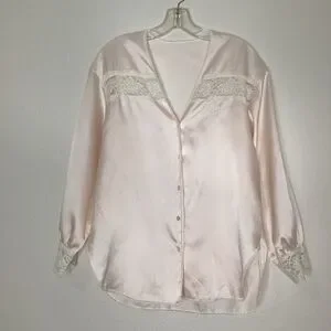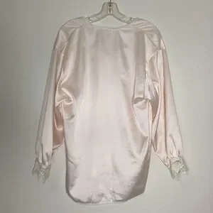 Approx 21” across chest, 21” across bottom, 29” long, 21” sleeves. Button front, wide sheer lace at chest and cuffs, petit lace on exposed edges, shirttail hem, satiny pale pink. Good condition.