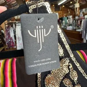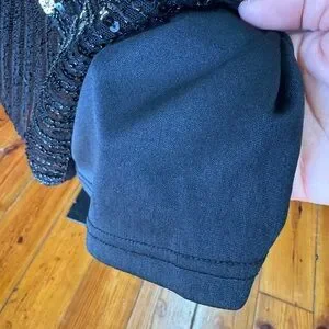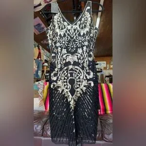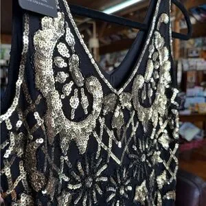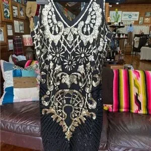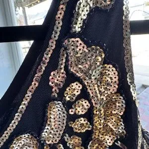 This stunning black dress features intricate gold embellishments, perfect for any special occasion. The elegant design adds a touch of glamour to your wardrobe.