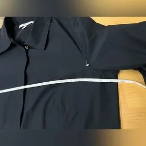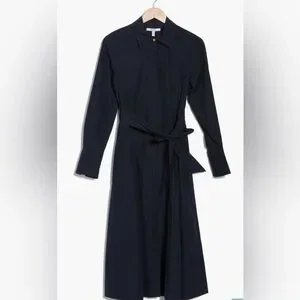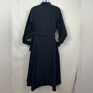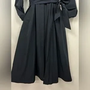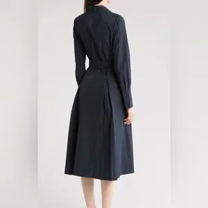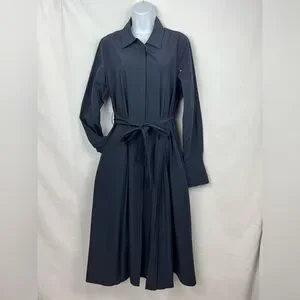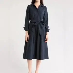 The crisp navy fabric and intricate pleated skirt create beautiful movement, waist tie to cinch for a feminine, custom fit. Dress up or dress down to office, a brunch date, or an evening event, this dress exudes "quiet luxury." Size: 12, Color: Midnight Navy, Details: Long sleeves, button-down front with hidden placket, classic collar, and elegant pleated midi skirt.
