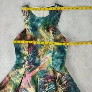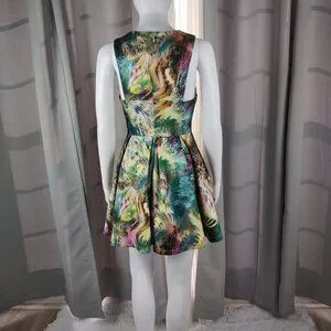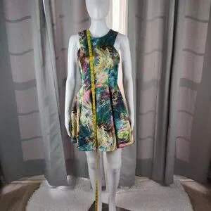 This sleeveless dress features a vibrant galaxy-inspired abstract print, flattering fit & flare silhouette, and pleated skirt. With its structured fabric and bold design, it's a standout piece for parties, nights out, or colorful casual wear.