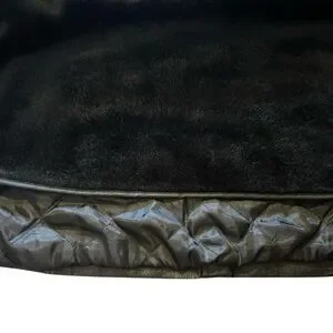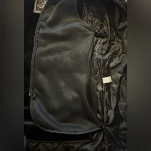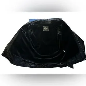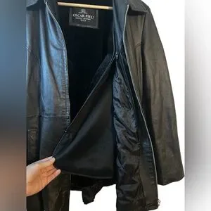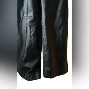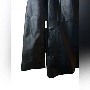 Beautiful black genuine leather coat with a belt. Removable faux fur lining for extra warmth. The lining can be zipped in and also has two buttons on each side to keep the lining in place. The zipper works as it should. Two hand pockets. There is some normal signs of wear on the elbows, but there is not any cracks or rips on the elbows or anywhere else on the coat. The size tag has been removed but it is estimated to be a women’s large based on measurements. Please refer to the following flat lay measurements before purchase: 21 inches pit to pit, 25 inch sleeve length and 29.5 inches shoulder to hem.