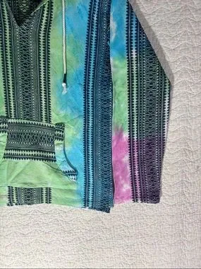 Vibrant Baja-style pullover hoodie. Tie-dye stripes in pink, green, and blue with black woven patterning. Hood with drawstrings and front kangaroo pocket. Relaxed, casual beach vibe. Coastal cowgirl, coastal, Spring, Summer