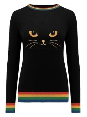 OXKnit NWT Women's Black Cat Vintage Fashion Art Jacquard Knit Sweater