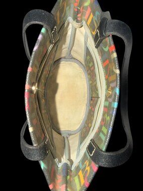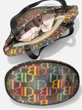This vintage Dooney & Bourke tote is a true collector's piece! Featuring a vibrant rainbow monogram design on coated canvas, complemented by black leather straps and drawstring detailing, making this bag a rare find!