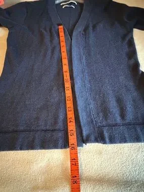 Lightweight cotton cardigan with an open-front design with hook and eye closures. Collarless styling for a clean look. Long sleeves and a relaxed silhouette. Easy to pair with casual or workwear outfits. Size S