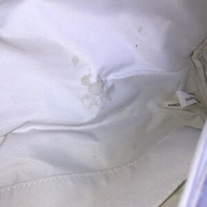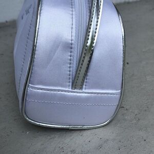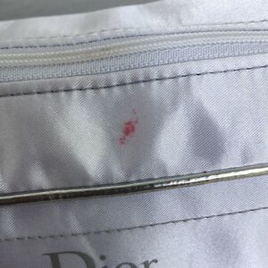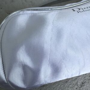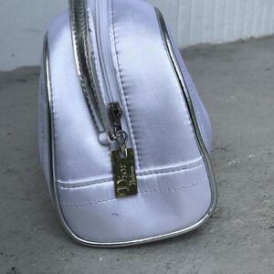 Dior Parfums Cosmetic tote please look at the pictures as it has some marks which I think would come out with spot cleaner. Also has creases from being stored. Measures 10.5 x 4 x 3. Satin finish with silver piping.