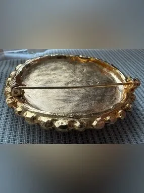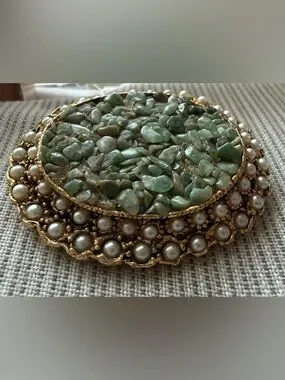 Jade Stone chips Green Gemstone Gold tone Faux Pearl Statement Brooch