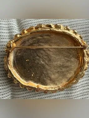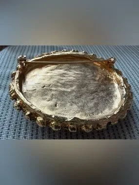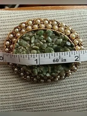 Elegant gold-tone brooch featuring green Jade gemstone chip inlay and a border of faux pearls. Versatile accessory for jackets, dresses, and scarves. Adds polished color and classic charm to any outfit.