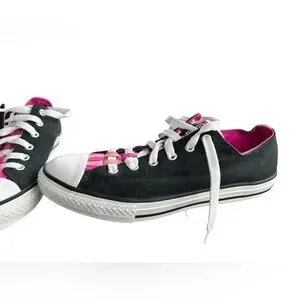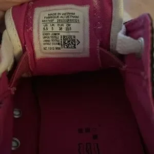 Excellent condition, worn once. Cleaned and sanitized. Junior size 5.5. Converse conversion says women’s 7.5. I’m a 7.5 and they are big on me, I’d say they’re closer to an 8. The tongue is covered in shoelace, that you thread your laces through.