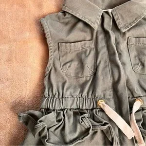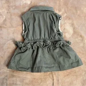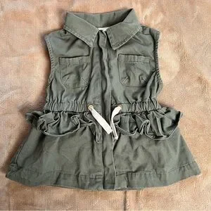 Mossy green cargo-style Aspen Kids drawstring waist cotton vest jacket top with a full zipper and ruffle details. Perfect for spring layering!