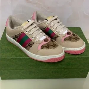 Authentic Gucci low-top sneakers in beige with pink accents. GG canvas panels and signature green-red-green web stripe. Lace-up design with cushioned insole. Pink-trimmed sole and logo hardware detail. Clean, stylish everyday sneaker.