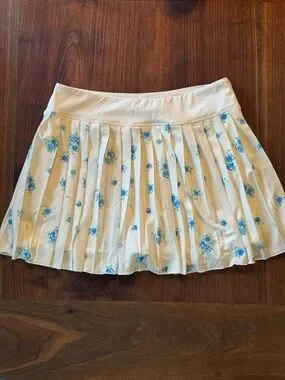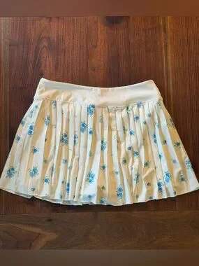 A lightweight pleated mini skirt with shorts underneath featuring a delicate blue floral print on a white base. Soft waistband for comfortable wear. Feminine silhouette that pairs easily with tees or blouses. Includes the identified white and blue color in the design.