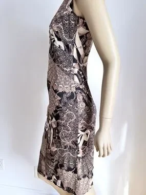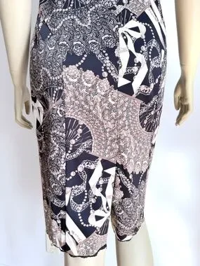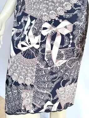 This figure-hugging pencil sheath dress features a very feminine print with bows, pearls and lace.
