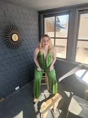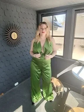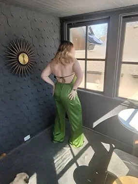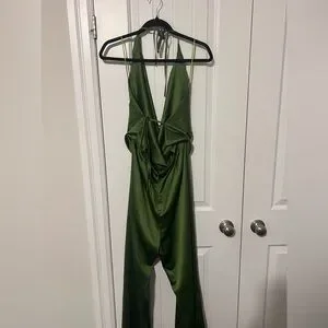 Elegant green halter jumpsuit with a draped cowl neckline and wide-leg silhouette. Smooth fabric and a fitted waist create a flattering, streamlined look. Perfect for events and evening wear.
