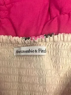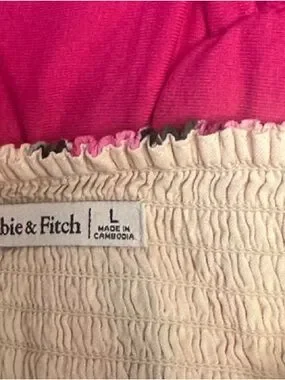 Off-shoulder crop top with puff sleeves. Smocked bodice for a snug fit. Bold floral print in pink and cream. Lightweight, breezy fabric ideal for warm days.