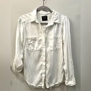 Lightweight button-down shirt by Abercrombie & Fitch. Dual chest pockets with long sleeves - button inside to roll up sleeves. Soft, drapey fabric for casual layering. Simple, versatile silhouette.