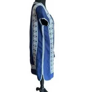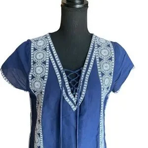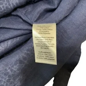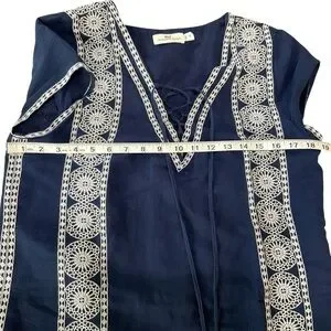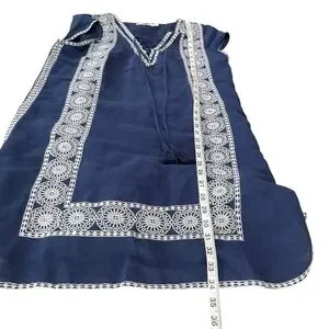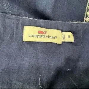 This gorgeous Vineyard Vines tunic dress features a rich navy blue fabric with intricate white embroidered trim and a lace-up neckline with tassels. Lightweight and breathable, it’s crafted from a blend of 65% linen and 35% cotton with a soft 100% cotton lining—perfect for summer days, beach vacations, or casual outings. Size 8 with a flat lay bust measurement of approx. 18.5”. Made in India. Excellent pre-owned condition.
