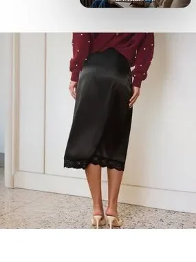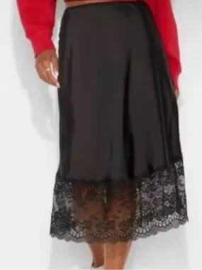 Beautiful Black Satin & Lace-Hem Midi Skirt