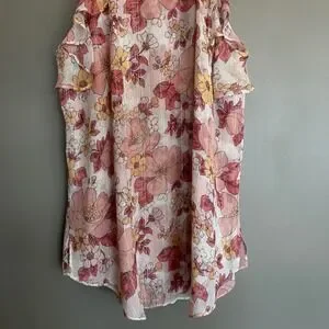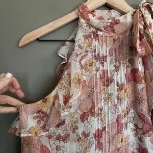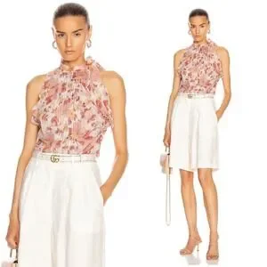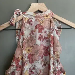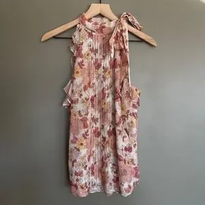 VERONICA BEARD Dali Metallic Stripe Silk Blend Tank Top, VERONICA BEARD Dali Sleeveless Blouse, Veronica Beard Floral Silk Halter Top, Size 6, Pink Off White Ivory Orange Metallic Gold, Ruffle Detail, Tie Neck, High Neck, Mock Neck, Excellent Condition with No Flaws