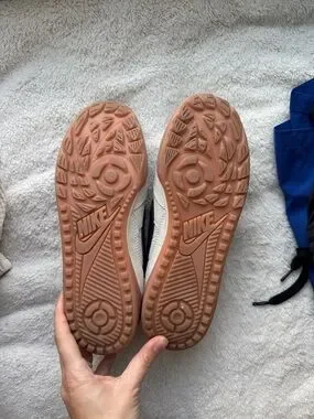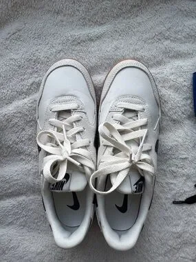 Classic Nike low-top running silhouette. White leather and suede upper. Navy Swoosh accents on both sides. Gum-colored rubber outsole for grip. Clean, versatile everyday design. Worn literally once!! Size 7