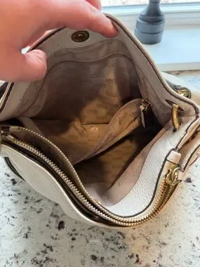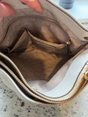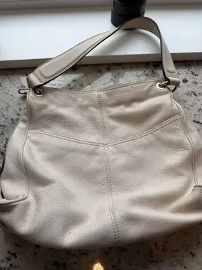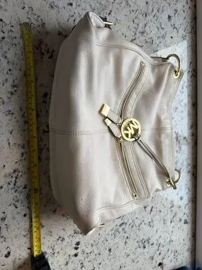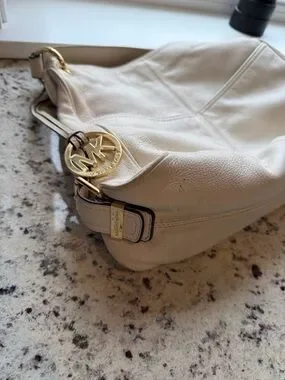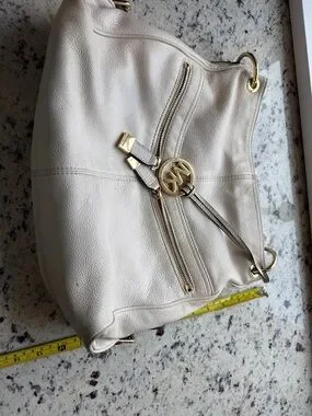 Michael Kors shoulder bag in cream pebbled leather. Front zip pocket with gold-tone zipper. Decorative MK medallion and strap tassel. Soft slouchy silhouette for everyday use.