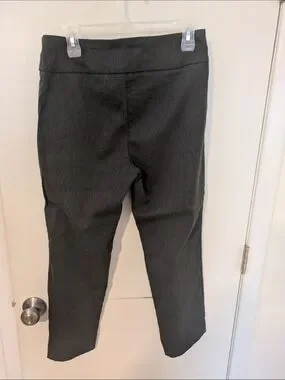 slim ankle pants in black ponte fabric. Comfortable stretch for all-day wear. Clean, versatile design perfect for work or casual outfits. Features a smooth waistband and a really slight pattern in the fabric that gives it a fun look (see last photo). like new!