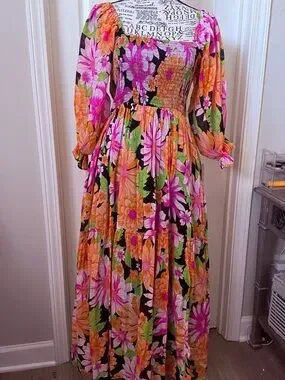 Smocked square neckline and fitted bodice. Long puff sleeves with elastic cuffs. Full tiered skirt with flowing silhouette. Bold floral print for a statement look. Lightweight fabric ideal for warm seasons.