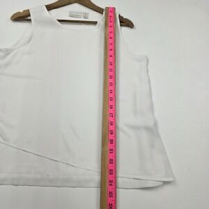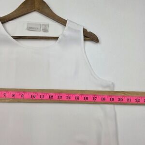 minimalist, classic, capsule, workwear, office, summer, chic, clean, chicos sleeveless blouse, womens small white top, layered hem tank, woven polyester blouse, white work tank top, wardrobe essential blouse, lightweight sleeveless shirt, business casual white top, versatile layering tank, crisp white blouse womens, everyday office top