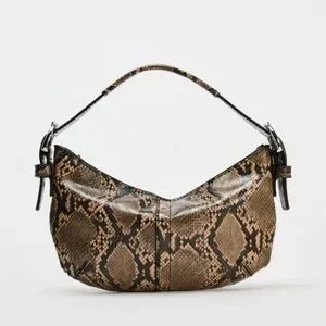 Zara shoulder bag with snake-print pattern. Single strap with buckle details. Curved silhouette and central seam. Sleek, textured finish.