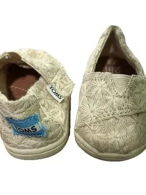 Toms slip-on shoes with floral embroidery. Cream fabric with subtle glitter accents. Elastic gore for easy on and off. Soft cushioned insole for comfort. Versatile casual style for everyday wear.