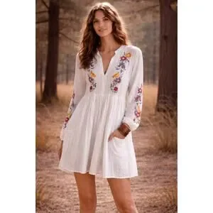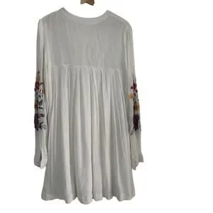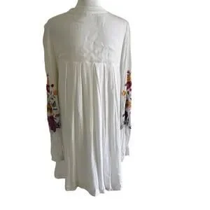 Romantic Free People Mia mini dress crafted in lightweight white gauze with colorful floral embroidery. Features a relaxed boho silhouette with long sleeves and soft texture—perfect for spring, summer, festivals, or casual everyday wear.