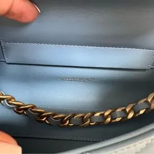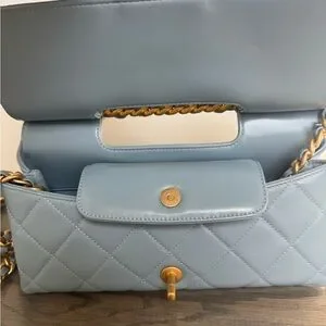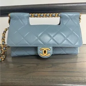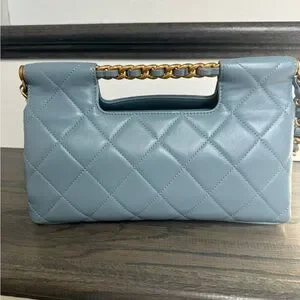 Chanel shoulder bag in quilted light blue leather. Features signature gold CC turn-lock. Chain-and-leather strap with gold links. Clean lines and classic Chanel quilting.
