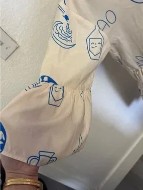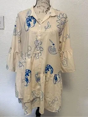 Elevate your vacation wardrobe with this chic and playful mini dress from Commense. Featuring a unique blue line-art graphic print on a cream background, this dress showcases Italian-inspired motifs like amphoras, pasta, suns, and the word "Ciao."