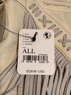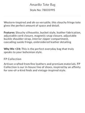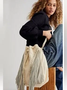 Free People Leather Amarillo tote bag in color neutral with gorgeous leather fringe, cinch top, adjustable leather strap with brass buckle, an open inside pocket and a zipped inside pocket with leather logo patch.