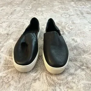 Slip on leather sneakers in black. White rubber sole. Size 8.5