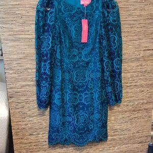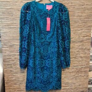 Lilly Pulitzer, Georgie Dress, Valencia Teal, NWT, Elegant Lace Dress, Long Sleeve, Sheer Sleeves, Carnival Lace, Teal Navy Lace, Size 00, Resort Wear, Party Dress, Back Zipper, Preppy Chic, Statement Dress