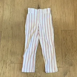White kids casual pants featuring vertical red pinstripes. Elastic waist for easy dressing and a comfortable fit. Lightweight, breathable fabric ideal for everyday play and activities. Pairs easily with tees and sweatshirts for a sporty look.