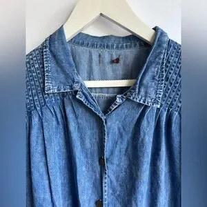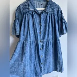 Denim Babydoll Dress Pleated Yoke Button Front Blue Size XL Cotton