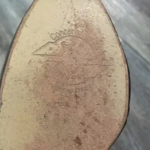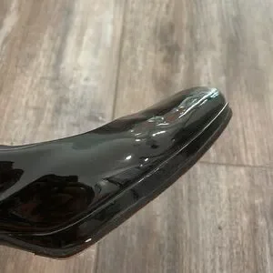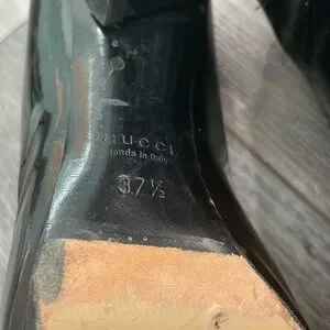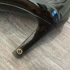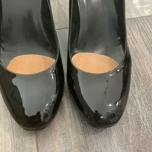 Round toe black patent pumps Comfort toe pad is stuck inside Gold logo on heel Some scuffs on heels