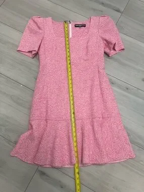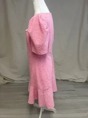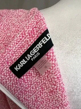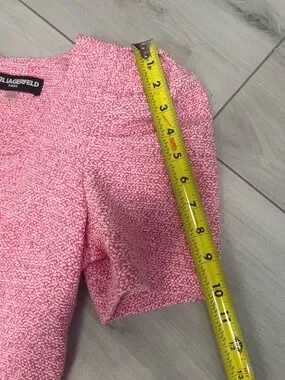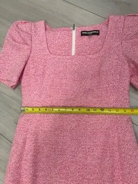Elevate your wardrobe with this timelessly chic Karl Lagerfeld Paris dress. Featuring a sophisticated pink and white tweed fabric, this dress strikes the perfect balance between classic tailoring and modern, feminine details. Flattering square neckline and romantic short puff sleeves. The structured bodice transitions into a playful flounce hem for beautiful movement. Ideal for office wear, weddings, garden parties, or a weekend getaway. Pair it with heels for a polished look or dress it down for a 'resort wear' aesthetic.