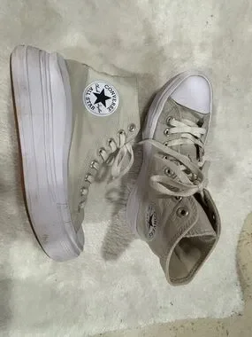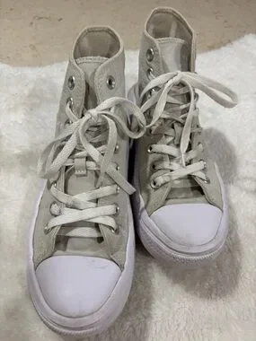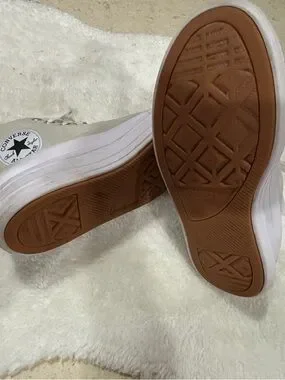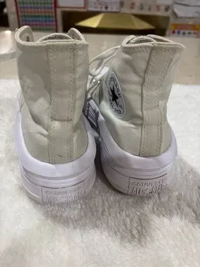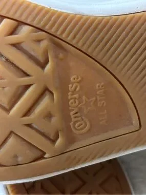 Classic Converse All Star sneaker. White upper with gum rubber sole. Signature Converse logo on sole. Clean, casual style.