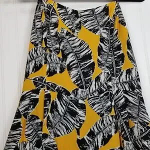 Olive + Oak cropped pant romper. Gently used, no holes tears stains or snags. Adjustable straps, back cutouts and back zipper. Wide cropped leg. Mustard yellow with black and white leaf print.