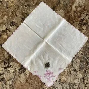 Vintage Classic white cotton handkerchief set with delicate pink and yellow floral embroidery. Soft, breathable fabric for everyday use. Elegant scalloped edge with pink stitching and subtle yellow floral detail. Lightweight and easy to care for. Adds a refined touch to any outfit.