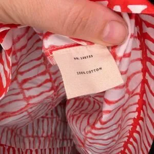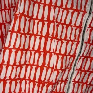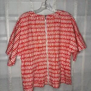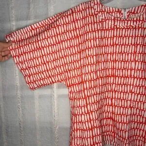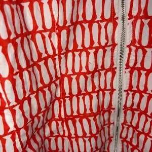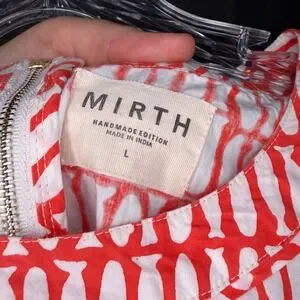 MIRTH handmade cotton top features a vibrant red and white block print with a unique fish-inspired geometric pattern. This lightweight piece is crafted from 100% cotton, offering a breathable and comfortable fit with a modern boxy silhouette and a functional back zipper detail. It is in excellent pre-owned condition, maintaining its crisp color and artisanal quality. Please note that because it is hand-printed, there are some misc splotches of dye - which ultimately makes it one of a kind! (pictured)