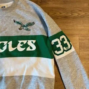 NFL crewneck sweater in grey with green and white team stripe. Large "EAGLES" chest lettering and embroidered eagle logo. Sleeve features numeric patch for sporty detail. Comfortable crewneck fit for casual wear.