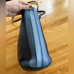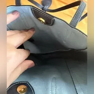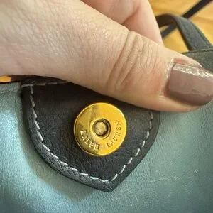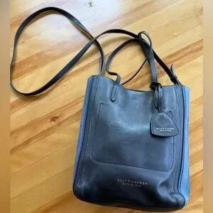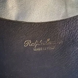 Ralph Lauren leather tote with structured silhouette. Smooth Navy leather body with blue side trim. light blue interior. Gold foil logo on front and branded leather hang tag. Slim shoulder straps for easy carrying. Made in Italy from calfskin leather