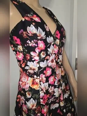 This gorgeous dress features a sleeveless, V-neck design with a fit-and-flare silhouette and a vibrant, multi-colored floral print that is more concentrated at the bodice and fades toward the hem.