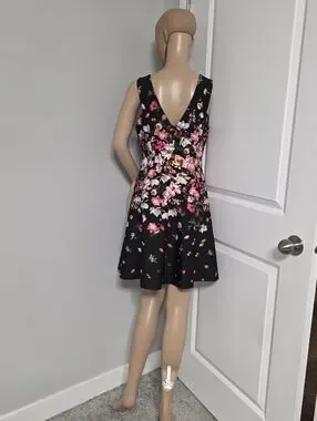 Jessica Simpson Black Floral V-Neck A-Line Flirty Pink & White Blooms Size 4