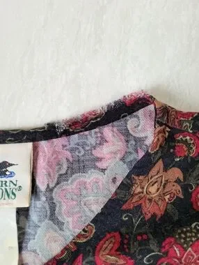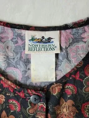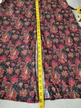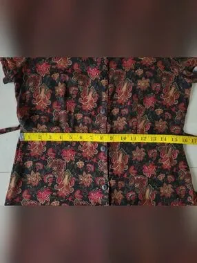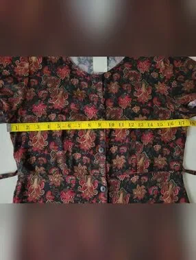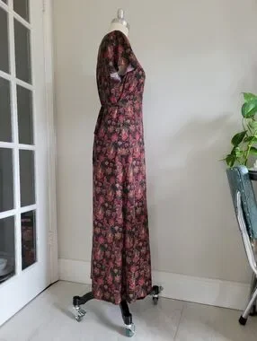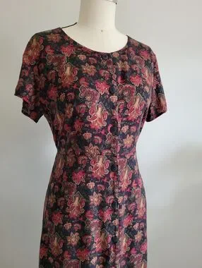 Vintage 90s button down shirt dress from Northern Reflections. Maxi length in a red, black and gold paisley floral print. Lightweight, flowy fabric. Tie at waist for an adjustable, comfortable and flattering fit. Short sleeves. Versatile and easy to style with sandals, sneakers, boots or heels. Very 90s Ralph Lauren style.